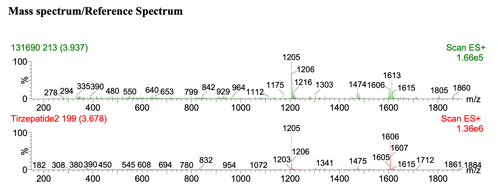 This graph shows an LC‑MS identity confirmation spectrum from Krause Analytical for a Tirzepatide sample, comparing an unknown sample (green, top) against a certified reference standard (red, bottom) using electrospray ionization in positive mode (ES+). The x‑axis is m/z (mass-to-charge ratio).